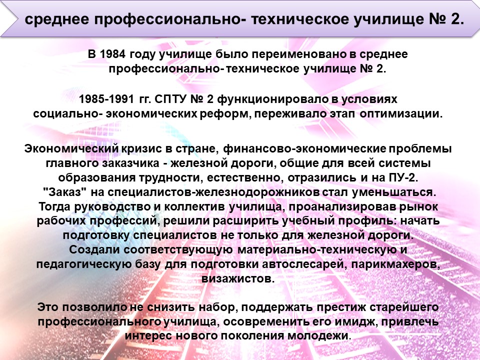 Новые экономические условия в стране диктуют коллективу лицея свои требования. Поэтому в настоящее время в лицее ведется подготовка специалистов по профессиям: "Машинист локомотива", "Помощник машиниста электровоза", "Слесарь по обслуживанию и ремонту подвижного состава", "Проводник на железнодорожном транспорте", "Парикмахер".