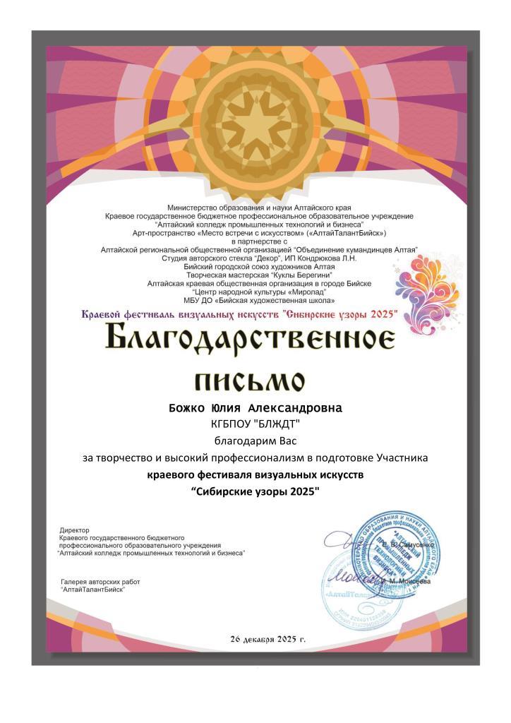 Фраза «Молодежь - наше будущее» давно стала крылатой. Это факт, с которым не поспоришь. Но не менее важно понимать, что молодежь - это и наше настоящее. Именно они являются самой инициативной и энергичной частью общества. Они живут, творят и созидают. Студенты Барнаульского лицея железнодорожного транспорта тому доказательство. Молодые люди умеют пользоваться любой возможностью для самореализации. Они дерзкие, жадные до новых знаний, творческие люди, способные модернизировать свои силы и направить их в то русло, которое им ближе по духу. Подведены итоги Краевого фестиваля визуальных искусств «Сибирские узоры 2025».