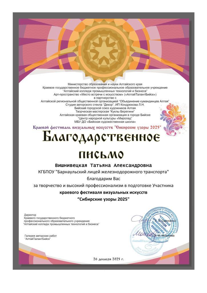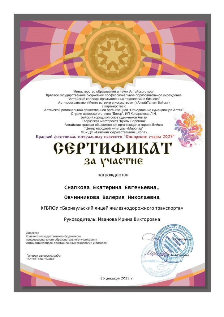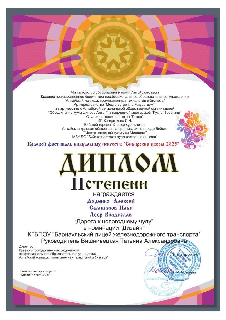 Интересный проект собрал 277 заявок на конкурс творческих работ, учащихся различных образовательных учреждений Алтайского края: школ, профессиональных лицеев, колледжей и организаций дополнительного художественного образования. Лицеисты под руководством своих наставников традиционно приняли участие и стали победителями! «Неизведанные творческие способности заложены в каждом из нас»- решили и доказали первокурсники. Диплом I степени в номинации «Художественная фотография»- Василенко Савелий Диплом II степени в номинации «Художественная фотография»- Дяденко Алексей, Леер Владислав, Селиванов Илья-обучающиеся группы ПМ 2511 Профессии 23.01.09 Помощник машиниста (по видам подвижного состава железнодорожного транспорта (электровоза), куратор Вишнивецкая Татьяна Александровна. Сертификаты участников получили Зырянских Полина, Овчинникова Валерия, Снапкова Екатерина-обучающиеся группы ПР 2411 Профессии 43.01.06 Проводник на железнодорожном транспорте, советник директора по воспитанию и куратор Иванова Ирина Викторовна; Здобникова Дарья, обучающаяся группы ТИК 2511 Специальности 43.02.17 Технологии индустрии красоты, куратор Божко Юлия Александровна. Благодарственным письмом награждены наставники, подготовившие конкурсантов.