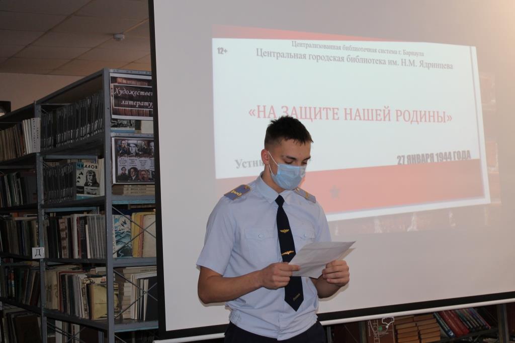 27 января в библиотеке Барнаульского лицея железнодорожного транспорта прошло совместное мероприятие - устный журнал «На защите нашей Родины», посвященный Дню полного освобождения советскими войсками города Ленинграда от блокады его немецко-фашистскими войсками в 1944 году с участием специалиста Центральной городской библиотеки им. Н.М. Ядринцева.